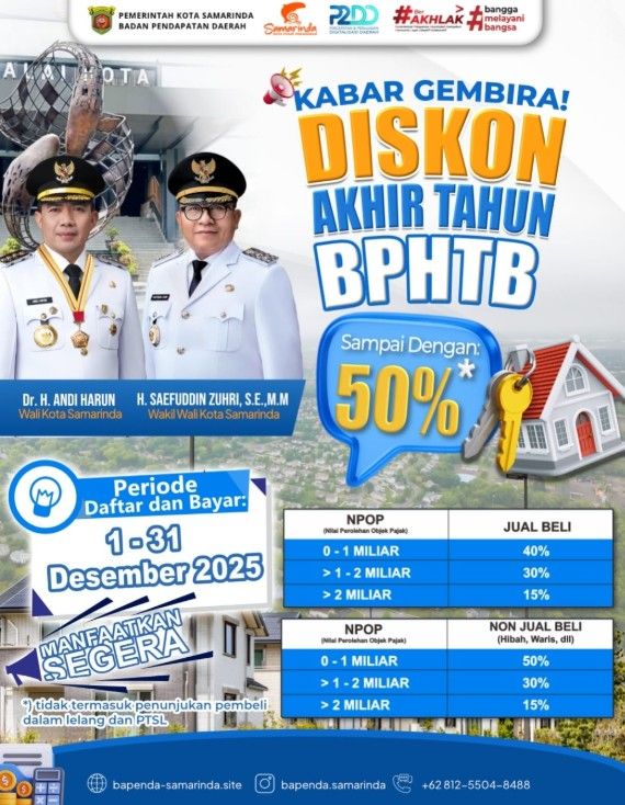 Melalui Badan Pendapatan Daerah (Bapenda), Pemkot resmi meluncurkan program Diskon Akhir Tahun Bea Perolehan Hak atas Tanah dan Bangunan (BPHTB) dengan potongan mencapai 50 persen. Program ini berlaku selama 1–31 Desember 2025, dan menjadi kesempatan bagi warga yang ingin menyelesaikan kewajiban perpajakan terkait tanah dan bangunan dengan biaya lebih efisien.